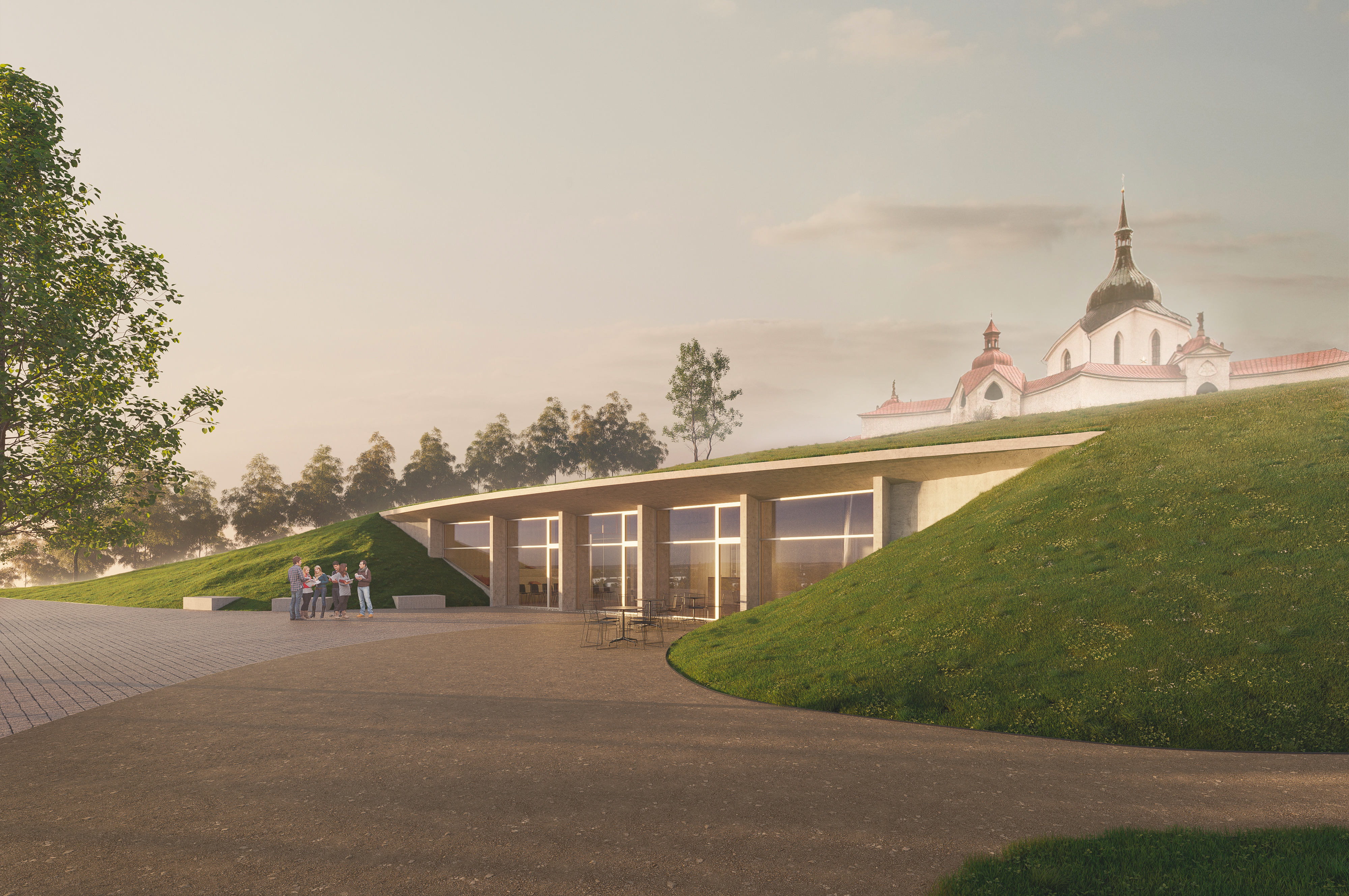 The ITC is placed aside, blending seamlessly with the slope, and avoids competing with the peak creation of architect Jan Santini. The monumental effect of the church at the hilltop is left to resonate fully, while the design of the ITC allows it to remain unobtrusive. The location of the ITC follows the existing built area and its technical infrastructure. The forecourt of the ITC is designed for tourists exiting buses and heading towards ticket sales, restrooms, or perhaps a lecture. The building naturally connects to the existing network of paths, with a new path extending along the contour toward the main pilgrimage route. The design minimizes traffic and paved surfaces. Short-term bus parking is situated parallel to Sychrova Street, while a new bus stop is placed closer to the main road to the church. At the foot of the hill, the design limits vehicular traffic, and permanent parking spaces are proposed on the opposite side of the street near the transformer station.